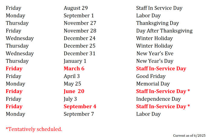 Lambertville Academy 2025-2026 School Year Closing Calendar